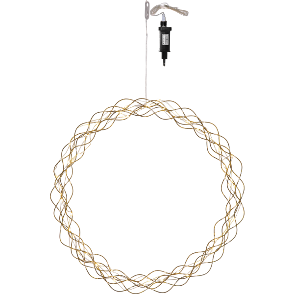 Dekorativ mässingsfärgad krans med dew drop ljusslinga för inomhusbruk. Kransen har 50 LED-ljuspunkter med varmvitt sken. Dimmer i tre steg och timer .Fin dekoration att hänga i fönstret.