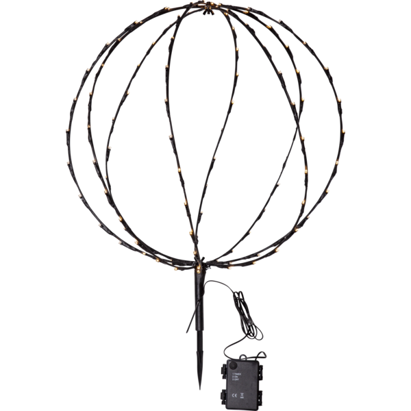 Dekorativt svart klot med 104 varmvita ljuspunkter, 50cm i diameter. Ger ett härligt ljus till din trädgård. Produkten kan användas som både hängande och stående, markspettet är avtagbart och det finns en krok för upphäng, för att inte belasta kabeln använd en kedja eller rep att hänga klotet i. Batteribox för utomhusbruk. Klotet är ihopvikbart vilket sparar utrymme när den inte används.