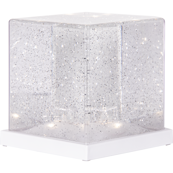 Batteridriven bordsdekoration med glittrande vätska. Inbyggd fläkt med motor ger en vacker dekoration med effekten av att det snöar inuti. Den inbyggda timern gör det lätt att ställa in när produkten ska lysa. Dekorera till jul och advent för den perfekta julkänslan. Placera iskuben i en hylla eller på ett bord och tänk på att inte placera den i direkt solljus.