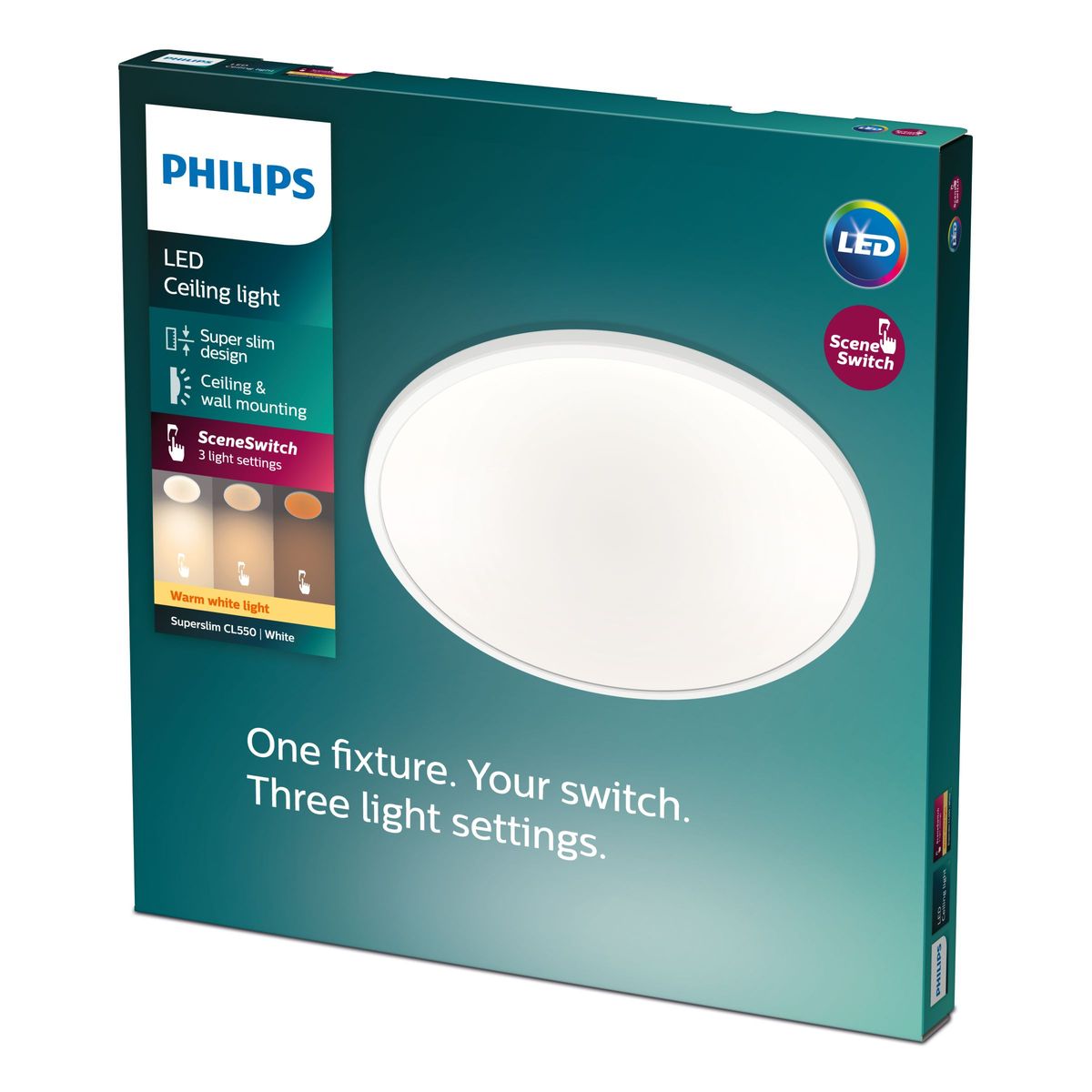 Skapa den rätta stämningen genom att ändra ljusstyrka. Philips SceneSwitch LED-taklampa ger dig tre ljusstyrkor som är perfekta för varje tillfälle. Kräver varken dimmer eller ytterligare installation - allt du behöver är din befintliga strömbrytare.